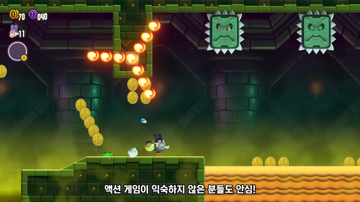 시리즈 최다의 12종류의 캐릭터가 조작 가능하고 요시와 톳텐은 데미지를 받지 않으므로 액션 게임을 잘 못하는 분도 즐길 수 있어서 아이들과 함께 하기에 좋아요.