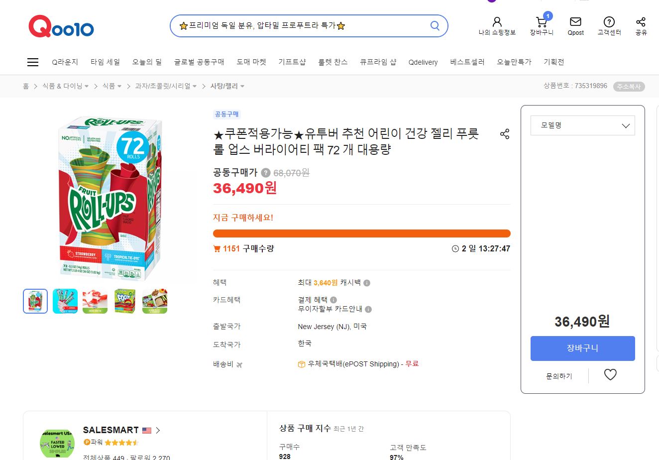 롤업젤리 파는곳 찾을때 해외직구 여기서 이용하는게 제일 저렴합니다. 구입할때 쿠폰 적용하면 2만원대 후반에 살수 있어서 좋아요.