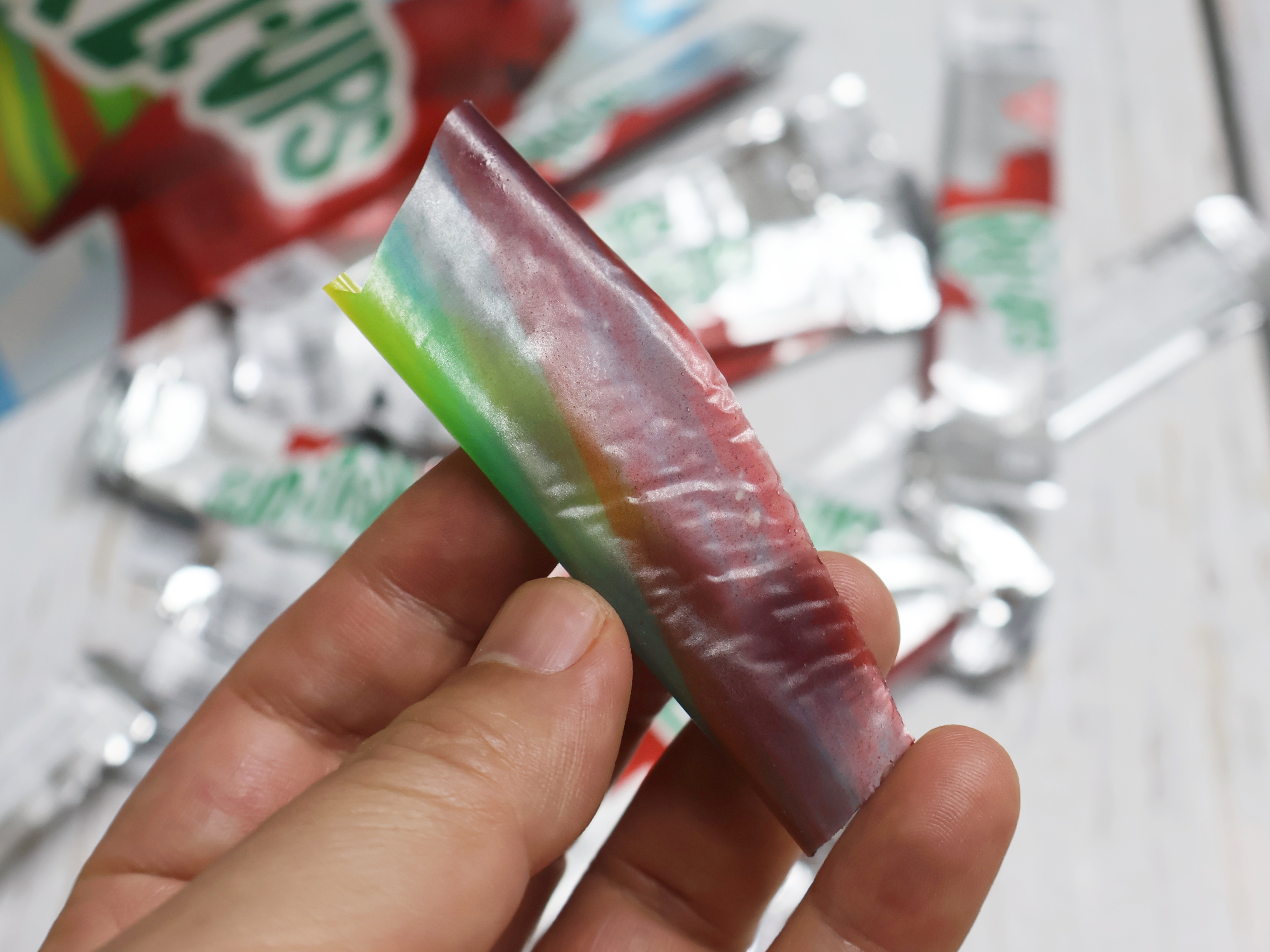 롤업젤리는 설탕에 색소를 가미해 얇게 펼친 젤리 제품이라고 보면 되는데요. 먹는 방법은 그냥 먹을 수도 있고, 아이스크림에 쌈처럼 싸 먹을 수도 있습니다.