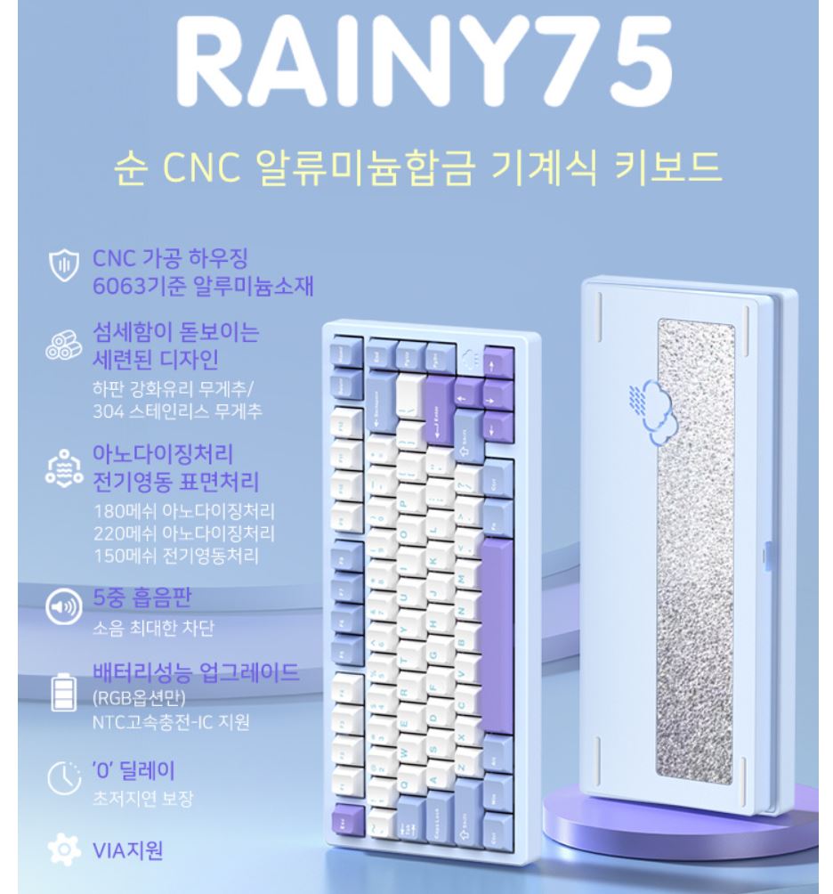 레이니 75 제품이 유명한 이유는 풀 알루미늄, 3모드 무선 연결, 스위치와 키캡 기본, 우수한 키감과 빌드 퀄리티를 갖추면서도 옵션과 구입 금액에 따라 8만원부터 15만 원 정도라서 가성비가 좋기때문입니다.