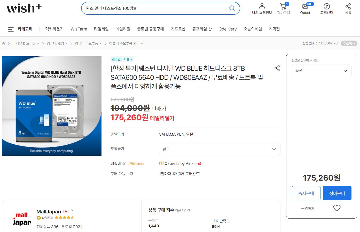 [175,260원](▼38%)[한정 특가]웨스턴 디지털 WD BLUE 하드디스크 8TB SATA600 5640 HDD / WD80EAAZ / 무료배송 /