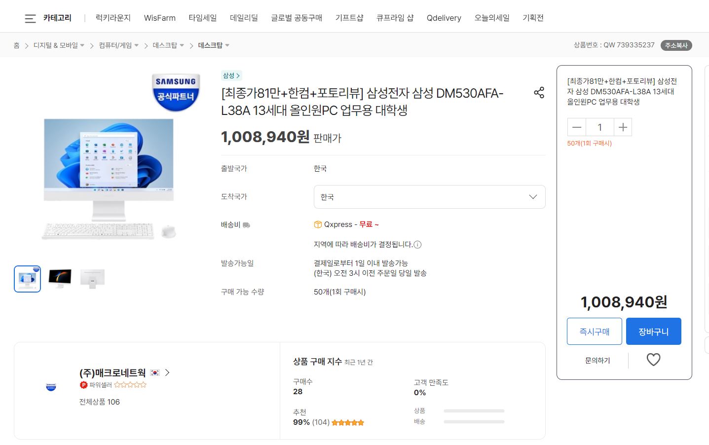 [1,008,940원][최종가81만+한컴+포토리뷰] 삼성전자 삼성 DM530AFA-L38A 13세대 올인원PC 업무용 대학생