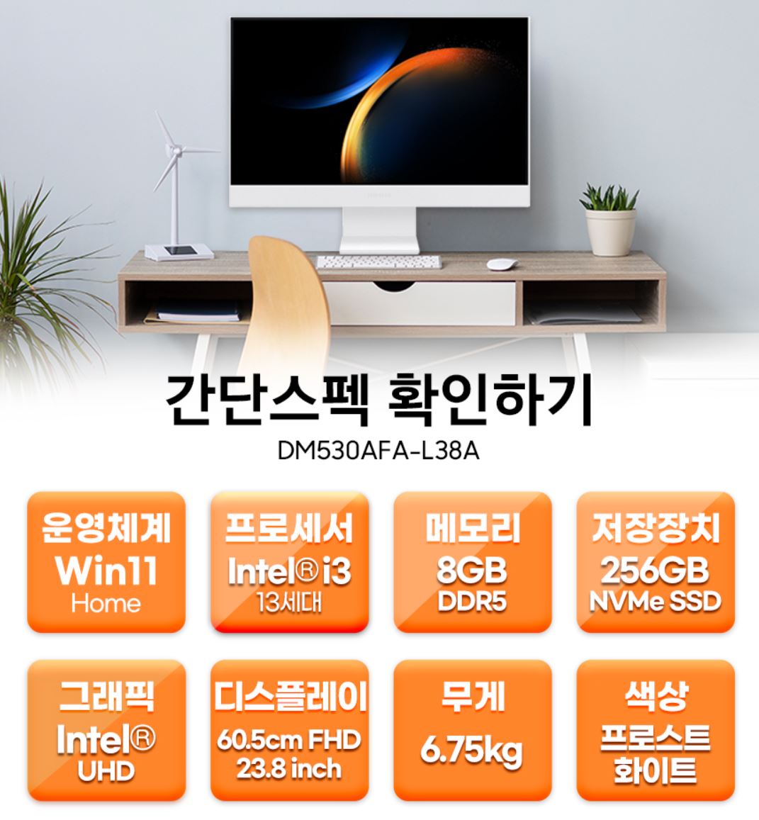 삼성 컴퓨터 DM530AFA-L38A 제품은 그리고 기본적으로 윈도우 11 Home OS 설치가 되어 있어서 구입 후 전원선만 연결하면 바로 사용할 수 있고 광시야각 패널이 적용되어 있어서 어느 각도에서도 선명한 화면으로 작업 할 수 있습니다.