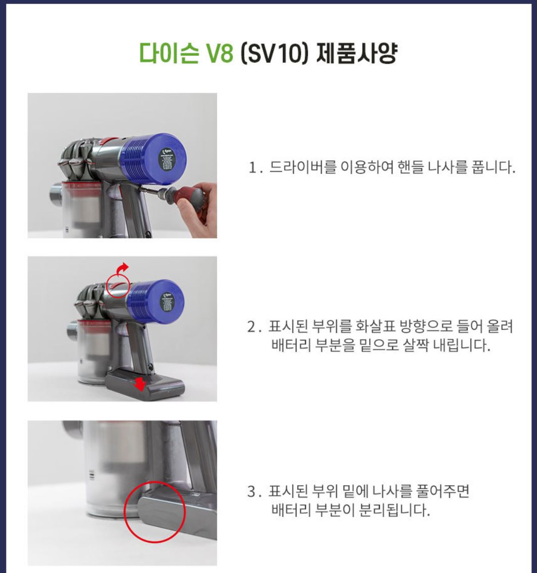 다이슨 모델에 따라 필요한 도구가 다를 수 있지만, 다이슨 V6 V7 V8 V10 청소기 제품이라면 드라이버와 새로운 배터리를 준비하면 손쉽게 할 수 있습니다.